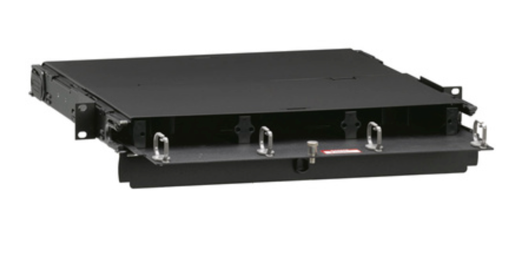 Empty 1RU Opt‑X 1000i SDX distribution and splice enclosure with removable sliding tray; supports up to three SDX adapter plates or MTP cassettes and three splice trays.