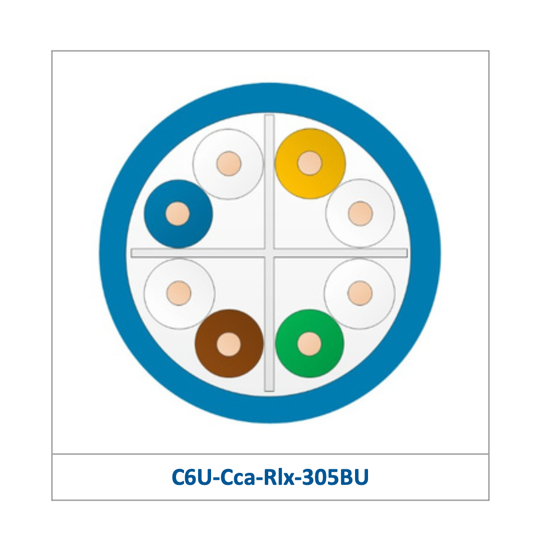 - Standard part number: C6U‑Cca‑Rlx‑305BU (305 m reel, Blue).